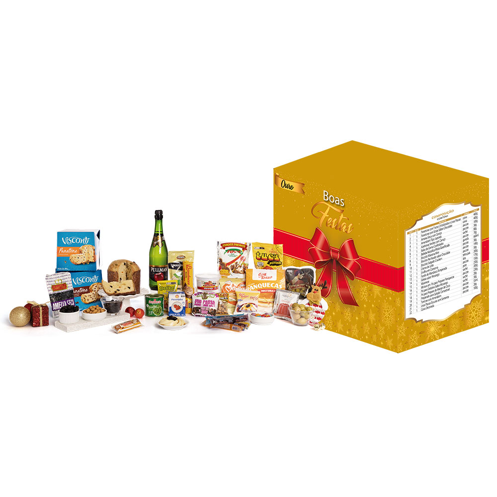 Composição: Ameixa Seca c/ caroço 100g | Amendoim Japonês 30g | Azeitona Verde c/ caroço 80g | Bala Delicado Deliket 70g | Biscoito recheado 140g | Biscoito | Maisena Mini 30g | Biscoito aperitivo Din Cracker 50g | Creme de leite 200g | Ervilha 170g | Espumante 660 ml | Farofa mandioca Temperada 150g | Geladinho c/ 5 unidades 55 ml | Geleia de morango 250g | Maionese 200g | Mistura p/ panqueca 230g | Panetone Gotas de chocolate 400g | Panetone de frutas 400g | Pó p/ gelatina 20g | Pó p/ manjar de coco 30g | Torrone c/ amendoim 20g | Uva passas sem semente 100g