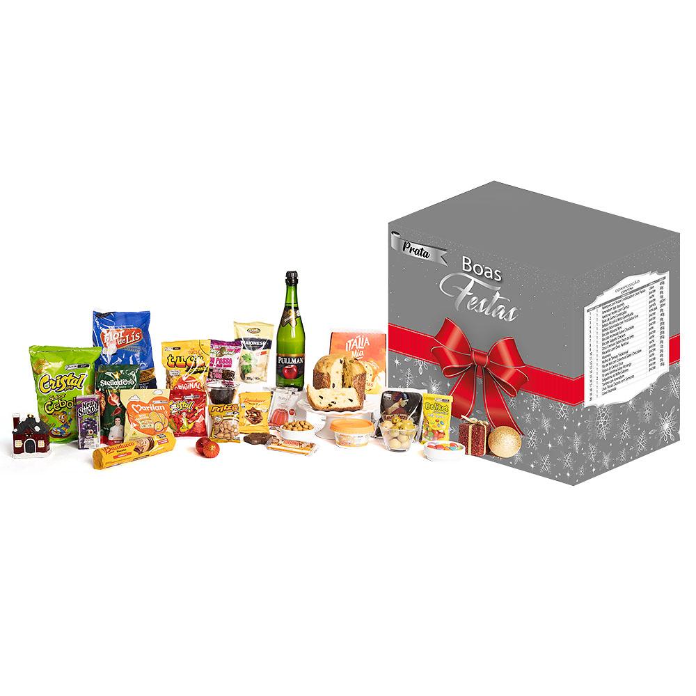 Composição: Amendoim Japonês 30g | Azeitona Verde c/ caroço 80g | Bala Delicado Deliket 70g | Biscoito recheado 140g | Biscoito Maisena mini 30g | Biscoito aperitivo Din Cracker 50g | Doce de Leite 200g | Espumante 660ml | Macarrão c/ ovos parafuso 500g | Maionese 200g | Molho de tomate 300g | Panetone de frutas 400g | Pão de mel 30g | Pipoca Doce 12g | Pó p/ gelatina 20g | Refresco Pronto 200ml | Salgadinho 40g | Torrone c/ amendoim 20g | Uva passas sem semente 100g