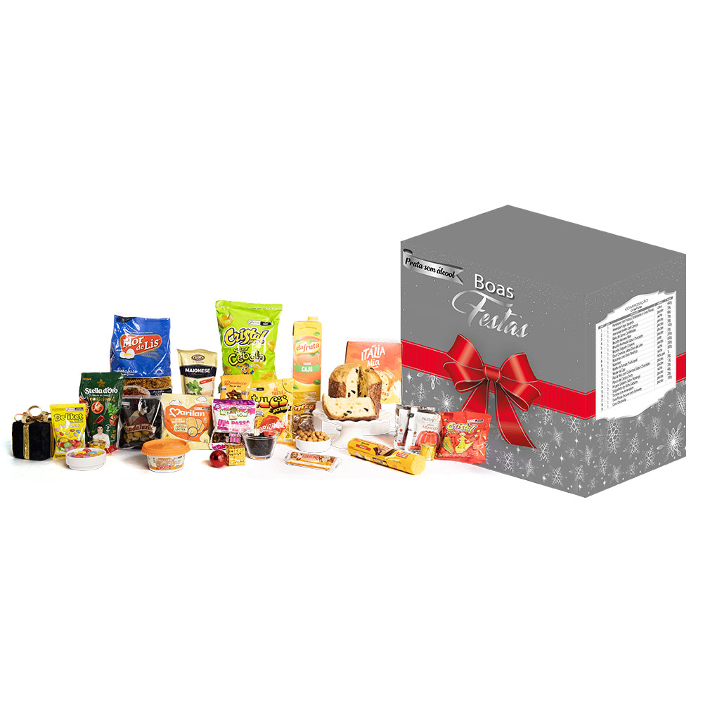 Composição: Amendoim Japonês 30g | Azeitona Verde c/ caroço 80g | Bala Delicado | Deliket 70g | Biscoito recheado 140g | Biscoito Maisena mini 30g | Biscoito aperitivo Din Cracker 50g | Doce de leite 200g | Macarrão c/ ovos parafuso 500g | Maionese 200g | Molho de tomate 300g | Panetone de frutas 400g | Pão de mel 30g | Pipoca doce 12g | Pó p/ gelatina 20g | Salgadinho 40g | Suco Nectar 1L | Torrone c/ amendoim 20g | Uva passas sem semente 100g