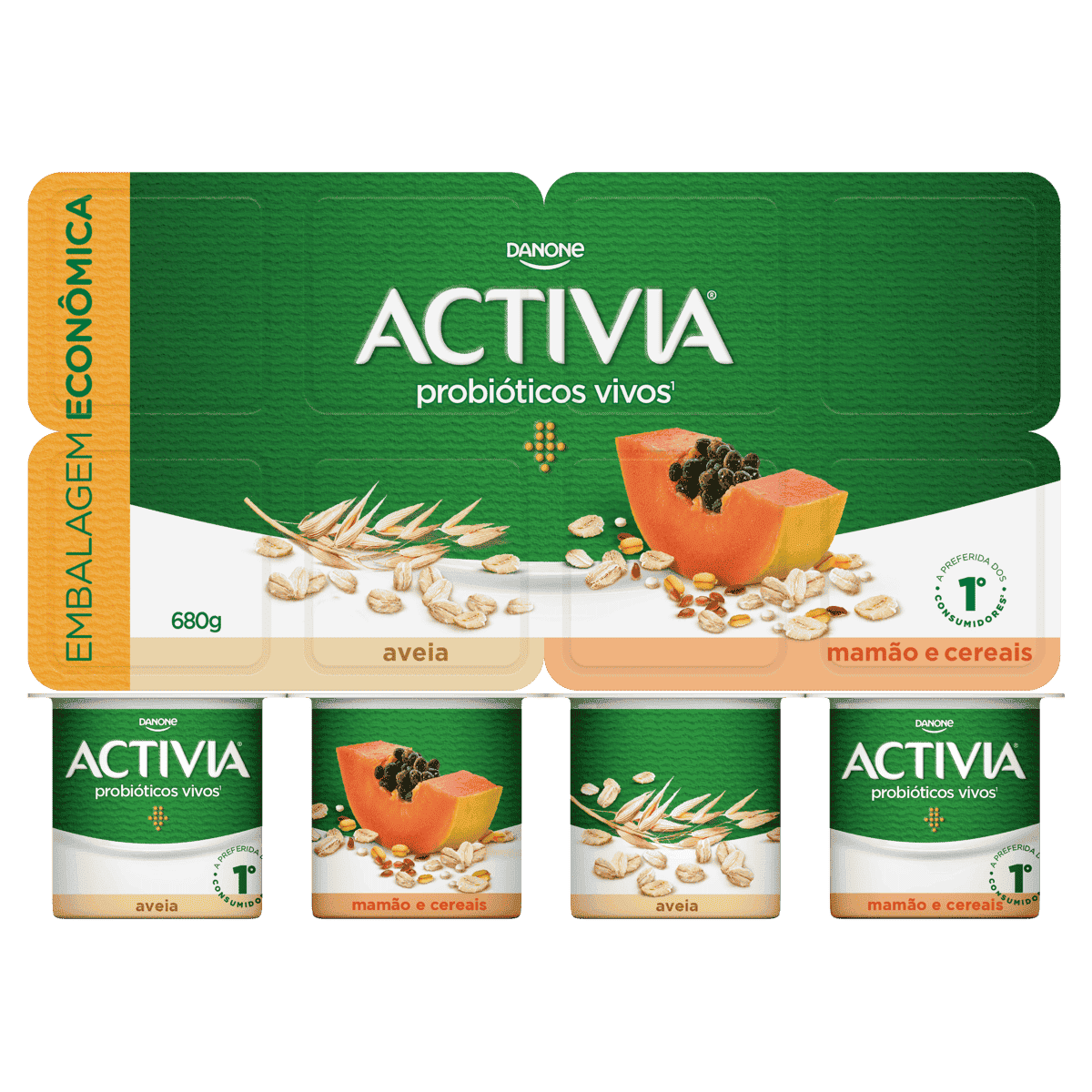 Com 8 unidades em uma embalagem de 680g, é fácil armazenar e levar para onde você for. Experimente o Leite Fermentado Integral Activia com Aveia, Mamão e Cereais e descubra uma maneira deliciosa de cuidar da sua saúde diariamente.