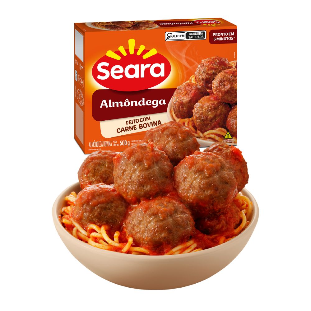 A almôndega Seara é feita com carne 100% bovina selecionada, moída no momento do preparo, e suavemente temperada com um toque de ervas finas.