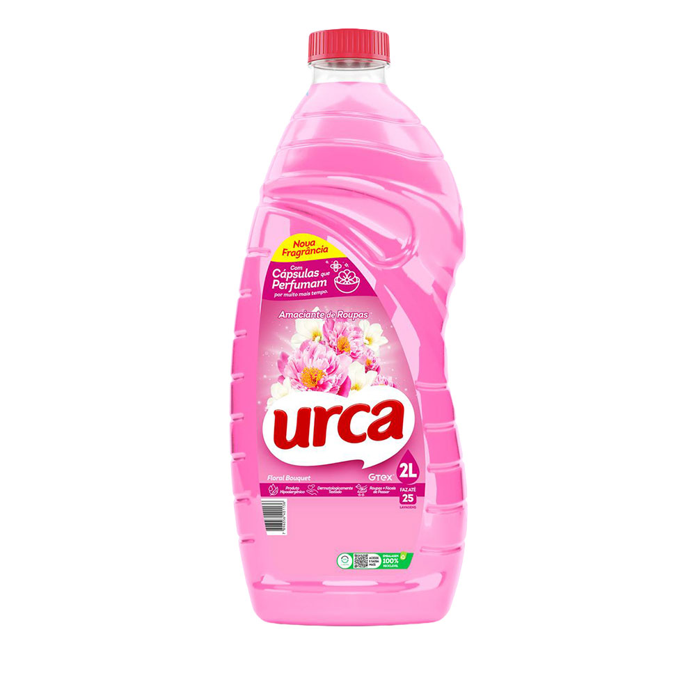 Amaciante Urca Floral 2L. Auxilia na limpeza das roupas, deixando uma fragância agradável e maciez no tecido.