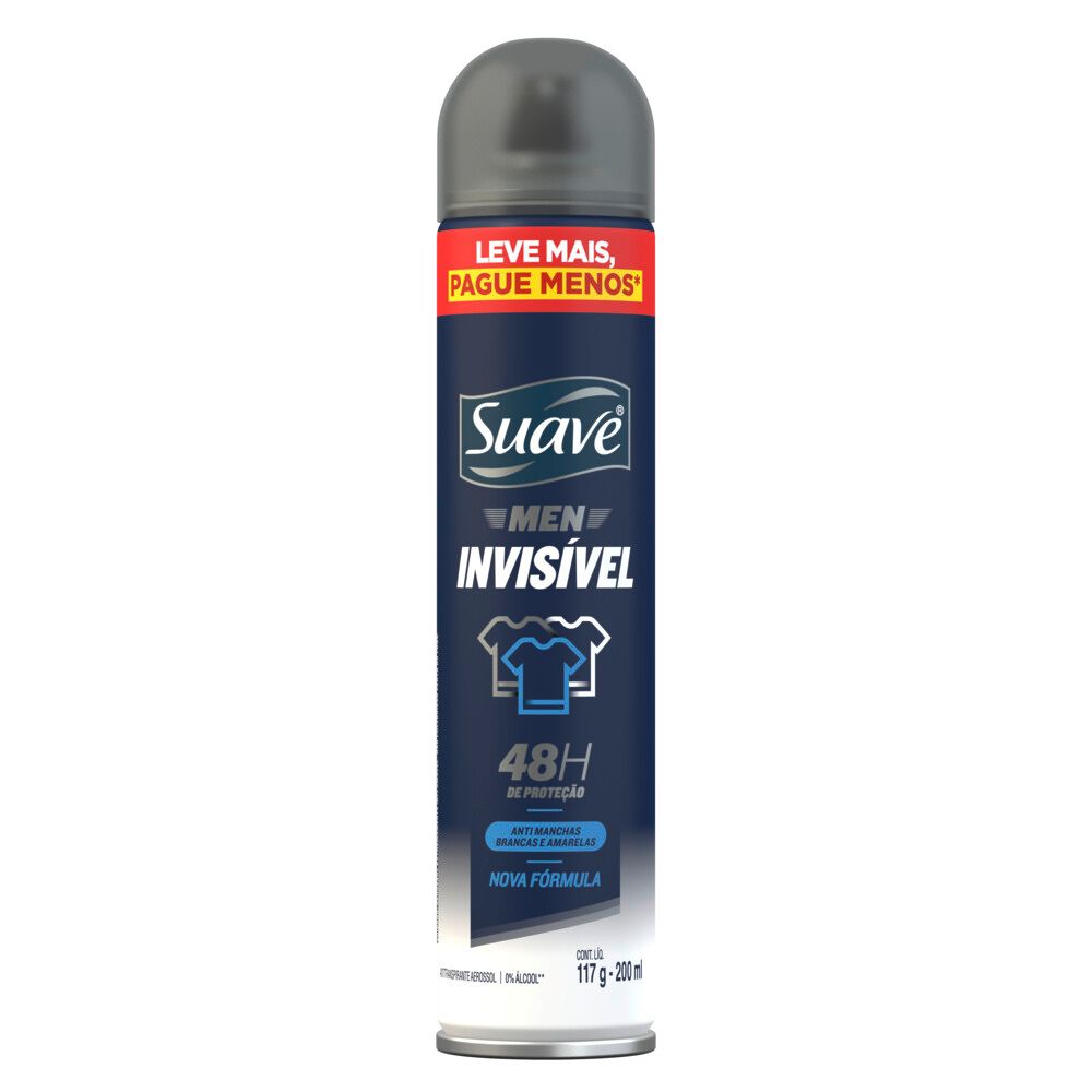 • O Desodorante Antitranspirante Suave Men Invisível garante 48 horas de proteção contra o suor e o mau odor • O antitranspirante masculino Suave Invisível previne a formação de manchas brancas e amarelas nas roupas • Desodorante masculino Suave Men possui nova fórmula com a tecnologia de micropartículas ativas, que te deixa seguro em qualquer situação • O desodorante spray possui o toque seco e sua composição é 0% álcool** • Este desodorante contém uma frangrância masculina que deixa sua pele com um perfume prolongado • Este desodorante masculino é dermatologicamente testado Nós sabemos e entendemos a importância que é se sentir seguro durante uma jornada intensa de trabalho. Para isso, o Desodorante Antitranspirante Suave Men Invisível garante 48 horas de proteção contra o suor e o mau odor. Sua fórmula previne a formação de manchas brancas e amarelas nas roupas. É ideal para todos os homens que saem cedo de casa para trabalhar e passam o dia fora. Nossa nova fórmula também possui a tecnologia de micropartículas ativas, que te deixa seguro em qualquer situação. O antitranspirante masculino Suave Invisível deixa suas axilas secas durante o dia todo. Sua composição é 0% álcool**, ajudando a evitar qualquer possível irritação na pele. O desodorante spray traz aquele frescor que te acompanha ao longo do dia. Este desodorante contém um perfume masculino, que protege as suas axilas contra o mau odor e te deixa perfumado o dia todo. O Desodorante Antitranspirante Suave Men Invisível dá aquela sensação única de recém-saído do banho. Agite antes de usar. Aplicar somente nas axilas e a uma distância de 15 cm da pele. Todos os nossos desodorantes e a linha Suave Men são dermatologicamente testados. Conheça todos os nossos produtos e fragrâncias da linha masculina. São eles: Invisível Men, Proteção Intensa e Sport Fresh. Leve mais e pague menos* com nossa embalagem de 200 ml. *Quando comparado à versão de 150 ml. **Não contém álcool etílico.