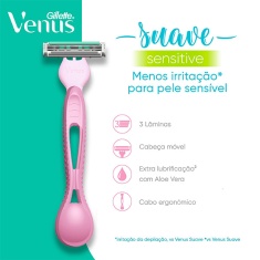 Os aparelhos de depilação descartáveis Venus Suave Sensitive possuem fita lubrificante com tecnologia Skin Elixir para facilitar o deslizamento e ajudá-la a ter uma depilação suave com menos irritação* (vs. Prestobarba2), ideal para peles sensíveis. Sua cabeça móvel se ajusta a suas curvas e suas três lâminas proporcionarão uma depilação rente e maciez por mais tempo* (vs. Prestobarba2). Venus Suave Sensitive é dermatologicamente testada para peles sensíveis. Para uma experiência incrível, use o Gel para Depilação Gillette SatinCare. • Fita lubrificante com tecnologia SkinElixir.