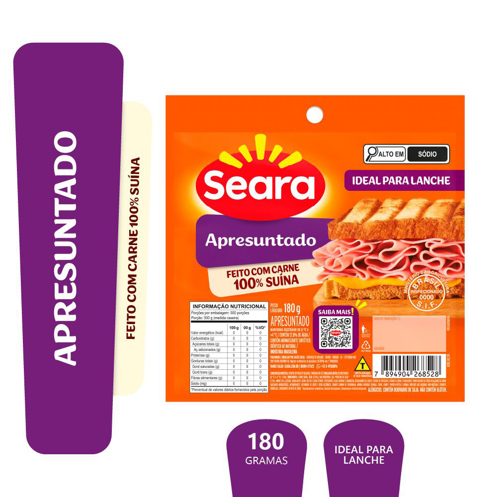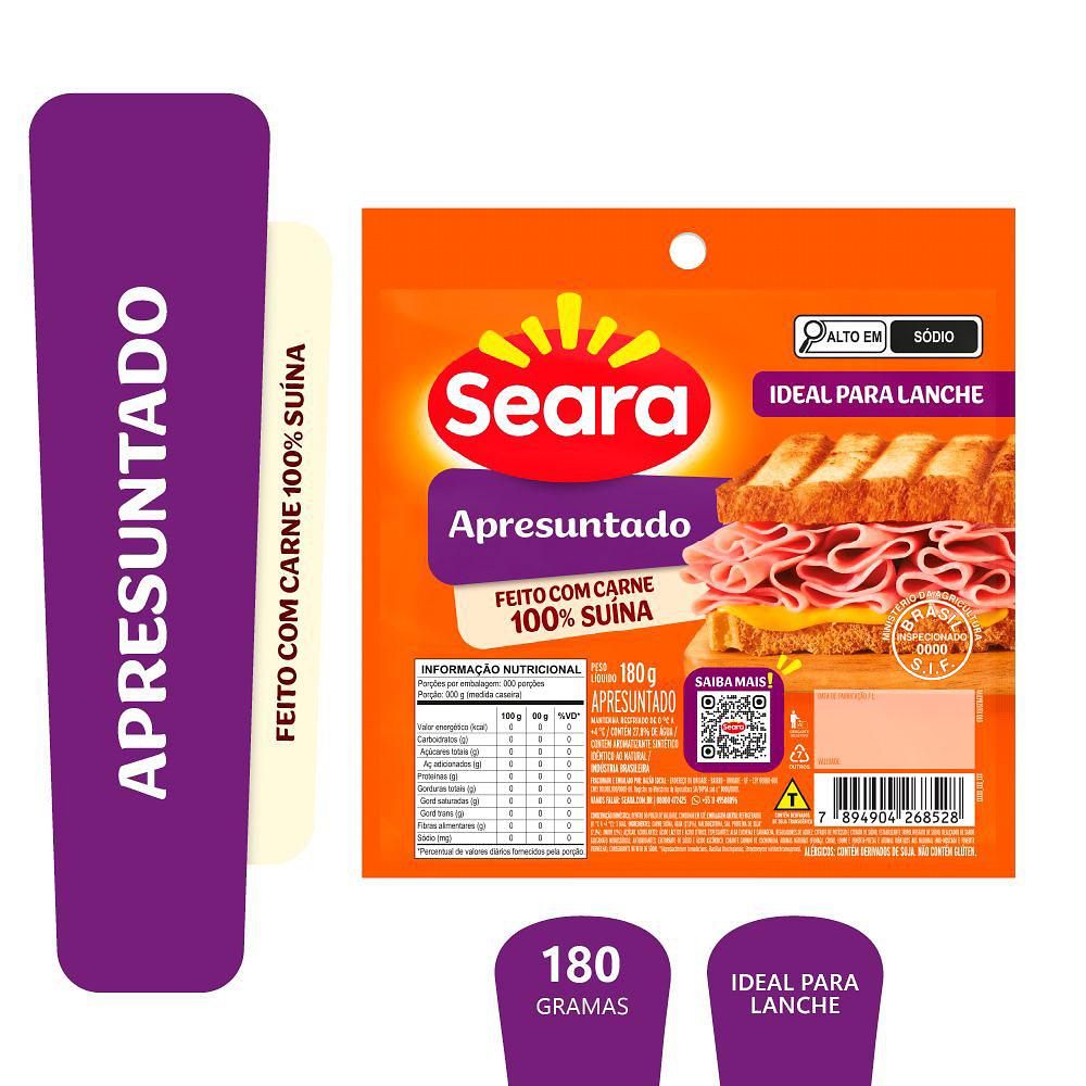 Apresuntado Seara fatiado em embalagem de 180g e preparado com partes nobres de suíno. Ideal para lanches, saladas e pratos frios.
