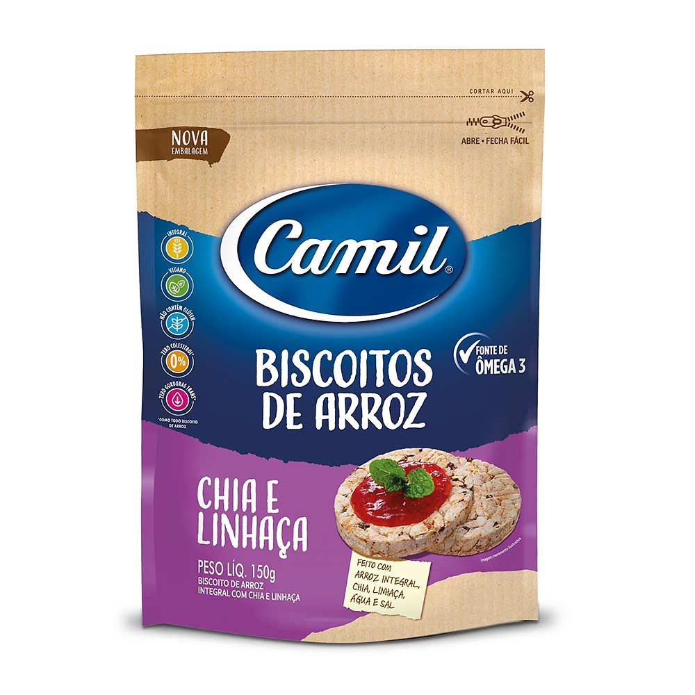 Chegou uma novidade para seus lanchinhos ficarem ainda mais gostosos e cheios de sabor. Já conhece o Biscoito de Arroz Integral Camil Com Chia E Linhaça? O Biscoito De Arroz Integral Camil com chia e linhaça é feito a partir de apenas quatro ingredientes: arroz integral, sal e grãos de chia e linhaça que, submetidos a altas temperaturas, se expandem e se condensam em um único biscoito, crocante e muito saboroso.