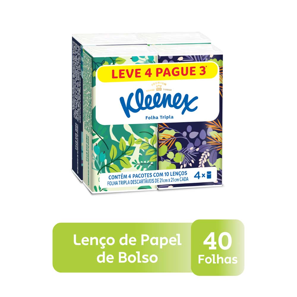 Lenço de Papel de Bolso Kleenex Folha Tripla com 4 pacotes de 10 folhas cada