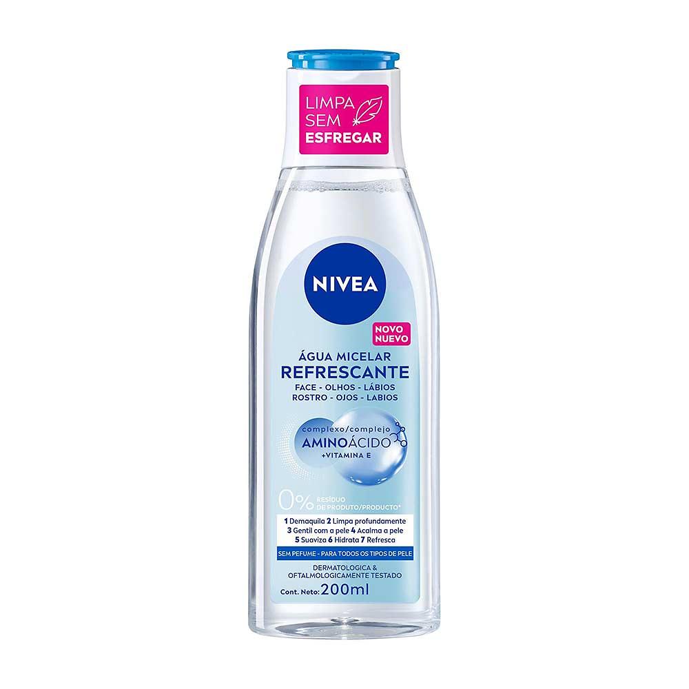 O que é? NIVEA Água Micelar Solução de Limpeza 7 em 1 Refrescante é uma solução de limpeza que retira todas as impurezas da pele, inclusive resíduos de maquiagem.Para que serve?Com complexo de aminoácidos e Vitamina E em sua fórmula, NIVEA Água Micelar Solução de Limpeza 7 em 1 Refrescante é gentil com a pele, acalma, suaviza, hidrata, refresca, demaquila e a limpa profundamente.Pode ser usado diariamente para retirar a maquiagem e fazer a limpeza das impurezas. Dermatologicamente e oftalmologicamente testado, é indicado para a pele do rosto, lábios e região dos olhos, não sendo necessário enxaguar. Benefícios e diferenciais:- Limpa profundamente- Demaquila- Purifica- Refresca- Suaviza