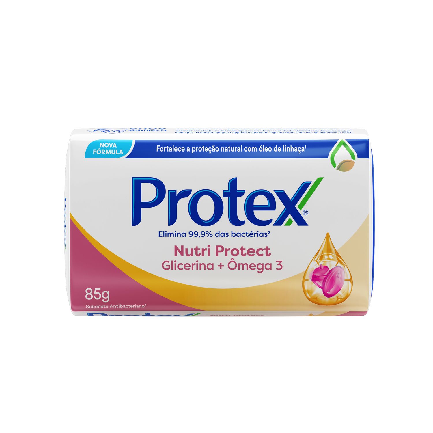Protex® Nutri Protect Ômega 3 oferece proteção antibacteriana natural com óleo de linhaça e elimina 99,9% das bactérias, garantindo proteção por até 12 horas.